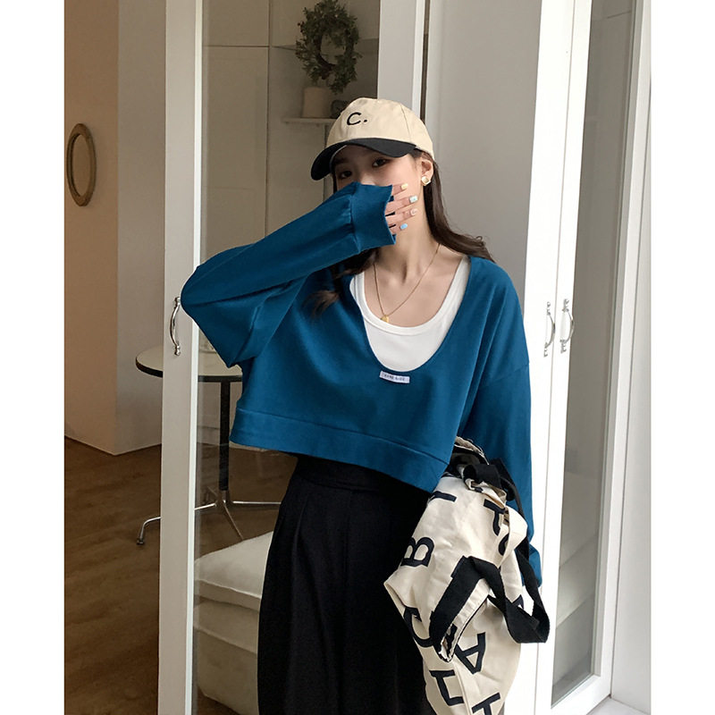 王妃家短款卫衣女潮ins设计感小众慵懒风U领叠穿小个子长袖上衣热门设计联盟服务商